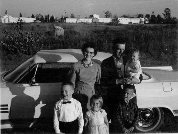 my mom's side of the family. top left: my gram, my gramps, my aunt michele. bottom left: uncle mark, my mom, uncle bruce. corn fields, old cars and dresses made from scratch.